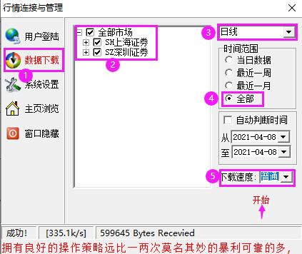 雙擊軟件右下角的燈塔圖標(biāo),打開【行情連接與管理】,點(diǎn)擊左側(cè)的【數(shù)據(jù)下載】,在【上海證券】和【深證證券】前面的方框打鉤選中,右上角的下載內(nèi)容選擇【日線】,時間范圍選擇【全部】,下載速度選擇【普通】,然后點(diǎn)擊【開始】,直至下載完畢。