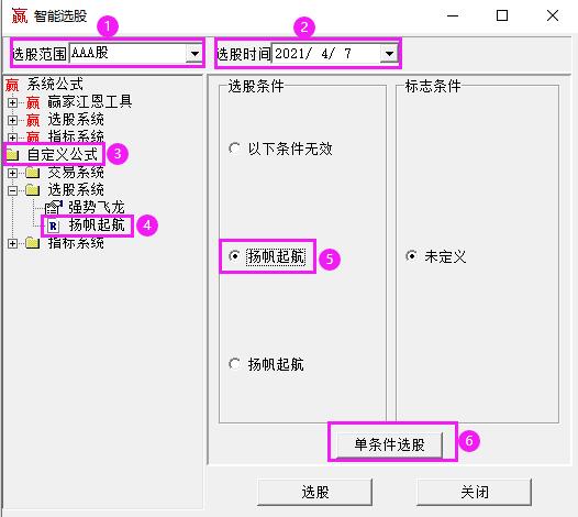 首先,選股范圍點(diǎn)擊旁邊的小三角,選擇AAA股,代表對滬市、深市、創(chuàng)業(yè)板所有上市公司進(jìn)行篩選。其次,選股時間默認(rèn)為當(dāng)日。接著,依次點(diǎn)擊【自定義公式】——【選股系統(tǒng)】——【楊帆起航】——【單條件選股】。