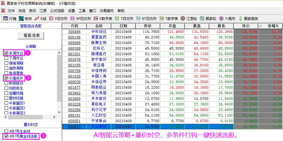 贏家江恩云策略智能選股功能,主要分為AI智能選股與技術(shù)選股兩大類型,以日線數(shù)據(jù)為選股基礎(chǔ),多條件打鉤匹配,一鍵快速篩選優(yōu)質(zhì)個股。AI選股模型為贏家財富網(wǎng)數(shù)據(jù)倉庫+時間周期密碼+數(shù)學(xué)量化模型+行業(yè)深度研究+資金動向的智能選股平臺,底層邏輯均是依托時間周期密碼運(yùn)行,目前贏家共推出十余種智能選股模型,詳見【贏家老子時間周期證券分析系統(tǒng)】介紹。技術(shù)選股主要將贏家多年實(shí)戰(zhàn)總結(jié)的選股模型編寫成選股指標(biāo),幫助投資者來篩選出符合條件的個股。軟件主要精選了4個選股器,分別為揚(yáng)帆起航、強(qiáng)勢飛龍、股海擒龍和靈蛇之珠。先來了解下這4個選股器的設(shè)計原理及選出來的個股風(fēng)格,方便用戶根據(jù)自己的操作需求選擇相應(yīng)的選股器。